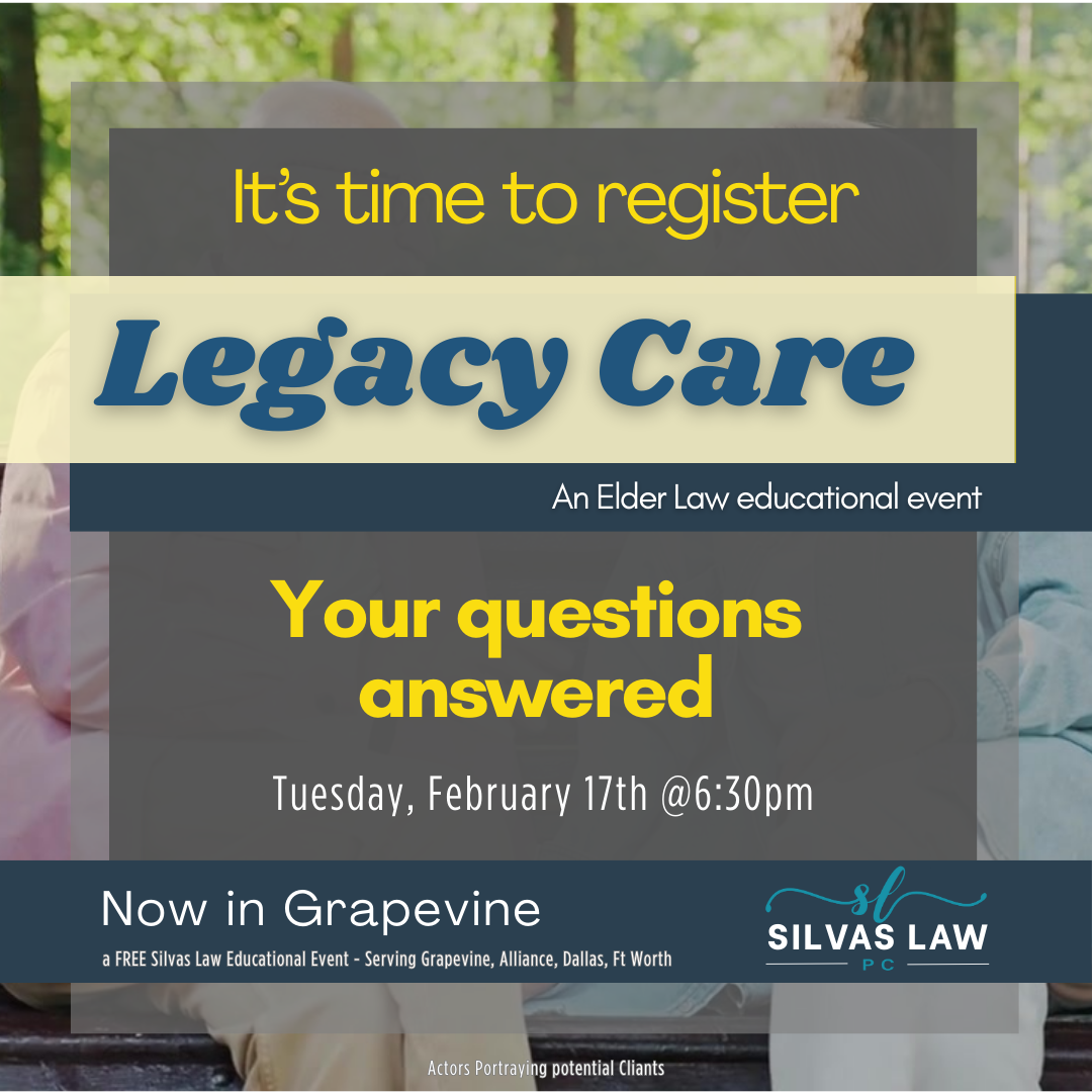 A FREE SILVAS LAW EDUCATIONAL EVENT When: Tuesday, February 3rd @ 6:30pm Location: Bessie Mitchell House 411 Ball St. Grapevine TX 76051 REGISTER TODAY Please register each person individually - unique email address required.